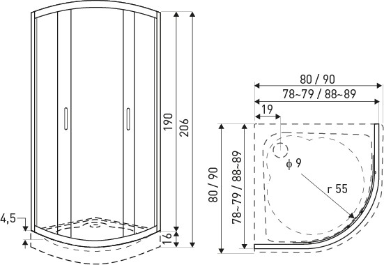 Štvrťkruhový sprchovací kút je dodávaný so sprchovou vaničkou s rozmermi 80 x 80 x 16 cm. K vaničke je potrebné dokúpiť sifón – odporúčame model Speed spriemerom 90 mm na optimálny odvod vody.
