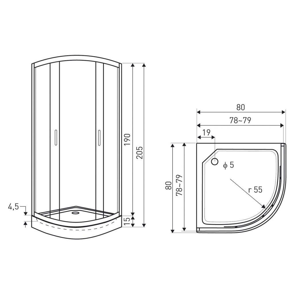 Štvrťkruhový sprchovací kút je dodávaný so sprchovou vaničkou XN s rozmermi 80 x 80 x 15 cm. K vaničke je potrebné dokúpiť sifón – odporúčame model Speed s priemerom 50 mm pre optimálny odvod vody.