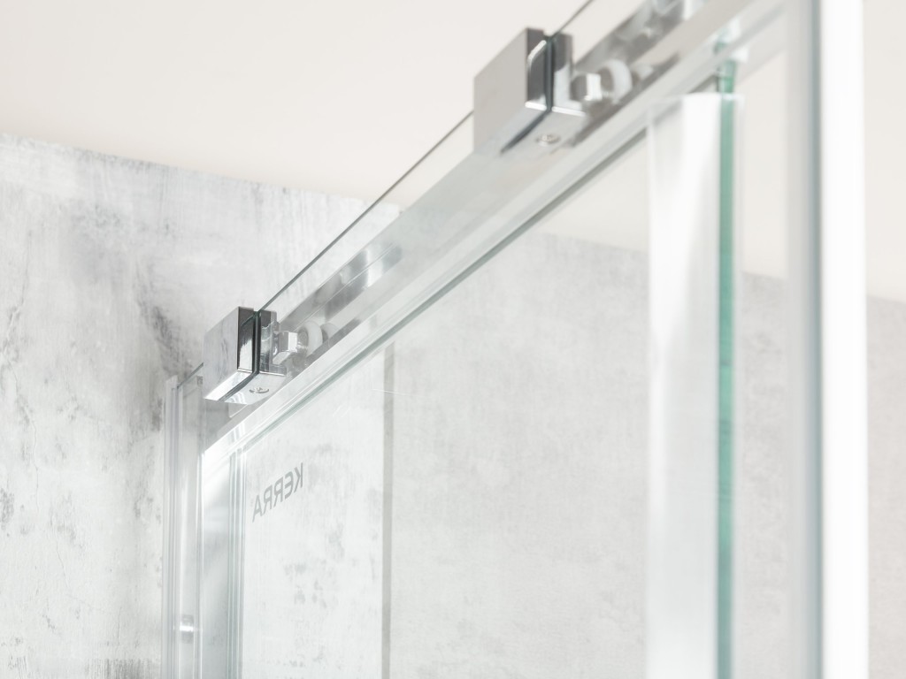 Posuvné dvojkrídlové dvere sa otvárajú hladko a ticho, čo umožňuje pohodlný vstup aj v stiesnených priestoroch. Priehľadné tvrdené sklo s hrúbkou 6 mm dodáva dizajnu nádych ľahkosti a povlak KERRA PROTECT zaisťuje stekanie vody z povrchu a zanecháva menej šmúh a šmúh.