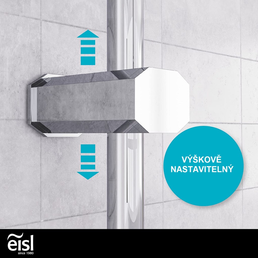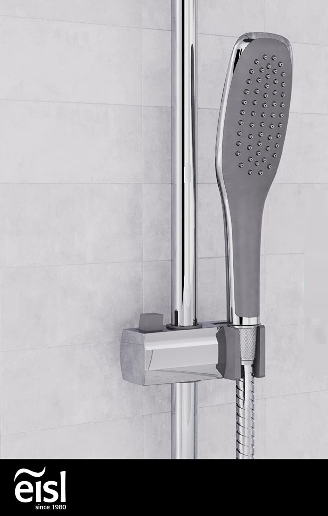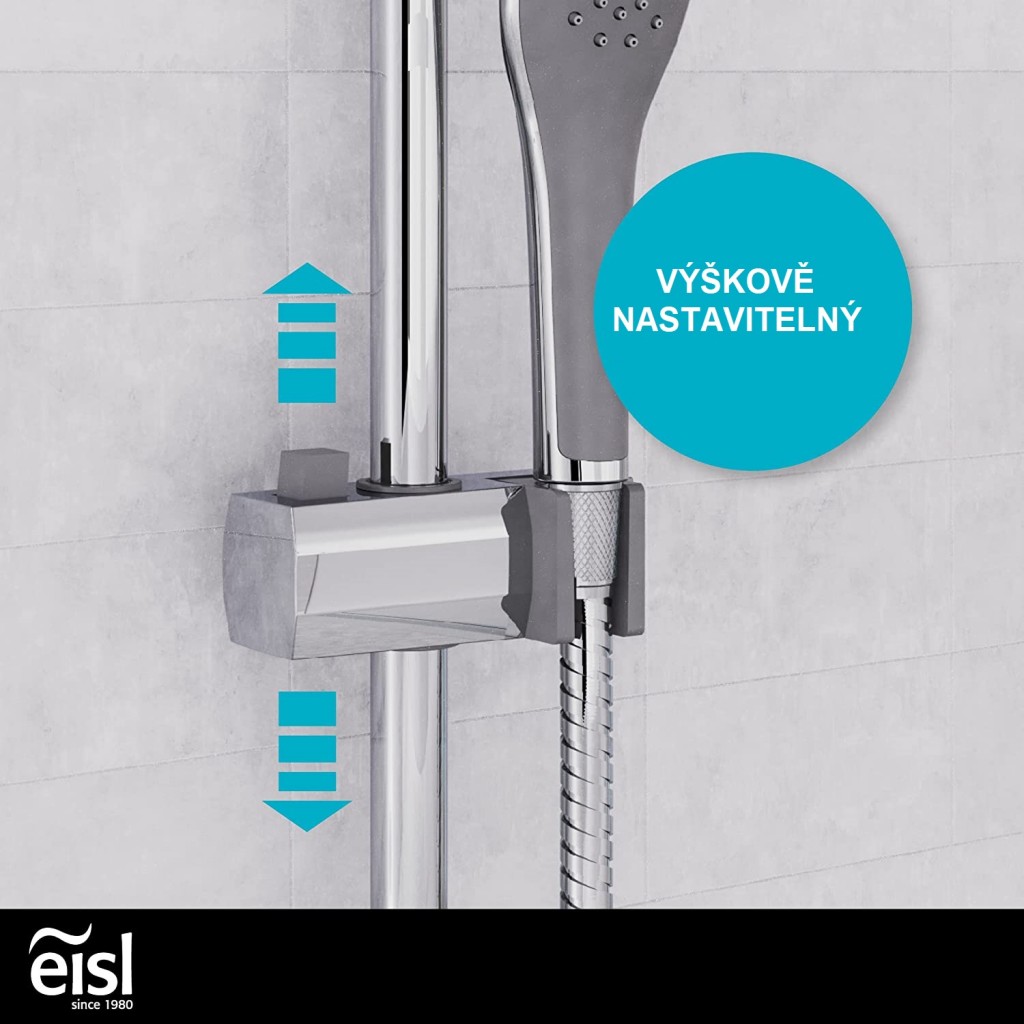 - Výškovo nastaviteľný nástenný držiak vrátane držiaka ručnej sprchy (s tlačidlom pre pohyb na stúpacej trubke)