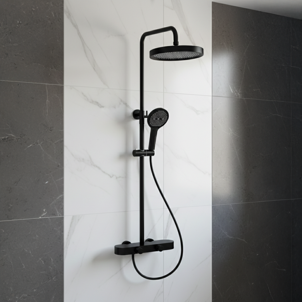 Sprchová súprava REA Creo Black je moderné nástenné riešenie, ktoré kombinuje elegantnú matnú čiernu s pohodlím každodenného používania. Model bol navrhnutý s dôrazom na funkčnosť a estetiku, vďaka čomu skvele zapadá do moderných, loftových aj industriálnych interiérov. Plynulé ovládanie pomocou otočných gombíkov - batéria je vybavená dvoma ergonomickými gombíkmi. Prvý umožňuje presné a pohodlné nastavenie teploty vody, druhý slúži na prepínanie režimov prúdu medzi hlavovou sprchou, ručnou sprchou a výtokom. Ručná sprcha s funkciou Bidetta – praktická ručná sprcha má tlačidlo na zadnej strane tela a ďalší vývod hore. Po aktivácii môže slúžiť ako bidetová spŕška, čo uľahčuje rýchle opláchnutie kabíny, umytie vaničky alebo naplnenie vysokého vedra. Diskrétny kaskádový výtok – integrovaný vaňový výtok poskytuje široký kaskádový prúd, ktorý sa hodí pri umývaní rúk alebo plnení nádoby bez použitia ručnej sprchy. galvanizácia. Povrch je hladký, odolný a rezistentný voči vlhkosti i každodennému používaniu. Pevná konštrukcia – telo batérie je vyrobené z odolnej mosadze, čo zaisťuje stabilitu a dlhú životnosť. Hlavová aj ručná sprcha z ABS sú ľahké, praktické a ľahko sa udržujú. Komfortné prispôsobenie – výškovo nastaviteľná tyč umožňuje prispôsobiť polohu hlavovej sprchy výške užívateľov aj usporiadaniu sprchovej zóny. REA Creo Black je premyslená sprchová súprava pre tých, ktorí očakávajú moderný vzhľad a pohodlné ovládanie. Funkčné riešenie a odolné materiály robia každodenné sprchovanie komfortnejšie a intuitívnejšie.
