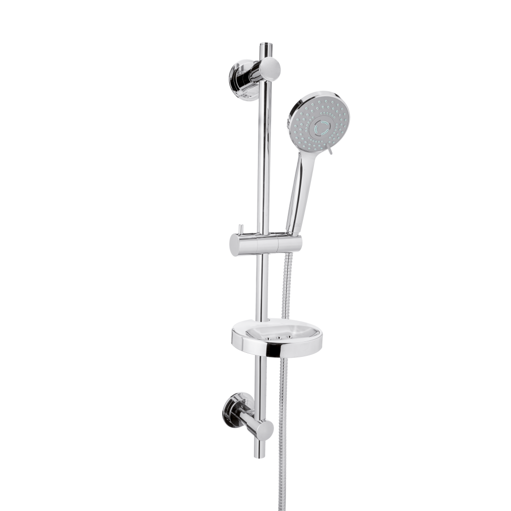 Nástenný sprchový set MILOS EXE s 3-funkčnou ručnou sprchou , so systémom proti usadzovaniu vodného kameňa ANTI-CALC . Sprchová tyč je s nastaviteľnými držiakmi s prísavkami, montáž nevyžaduje použitie náradia na vŕtanie do steny.