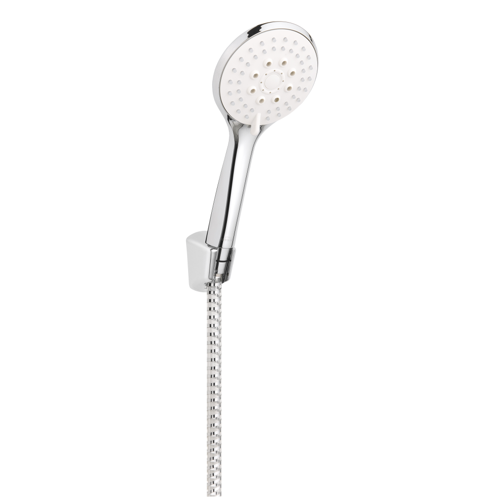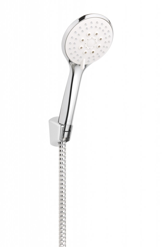 Nástenný set MINI LARISA - jednobodový pevný držiak ručnej sprchy s 5-funkčnou ručnou sprchou , so systémom proti usadzovaniu vodného kameňa ANTI-CALC a plastovou hadicou dĺžky 150 cm.