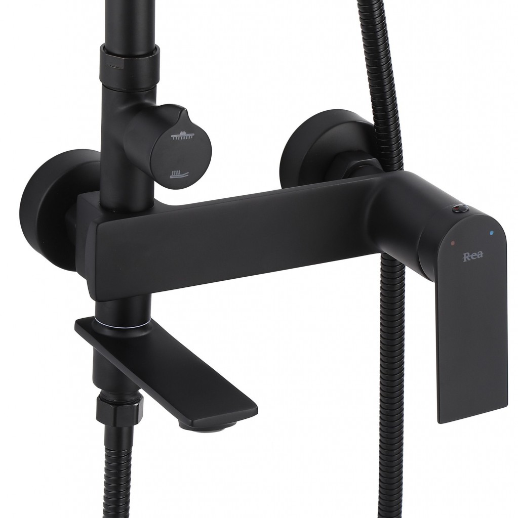 Ponúkaný sprchový set Rea STORM je dostupný v čiernej matnej, grafit matnej a zlatej lesklej farbe . Telo batérie bolo vyrobené z mosadze a pokryté povrchovou úpravou chrániacou sprchovú batériu pred poškodením a koróziou. Sprchový stĺp je určený na montáž na stenu.