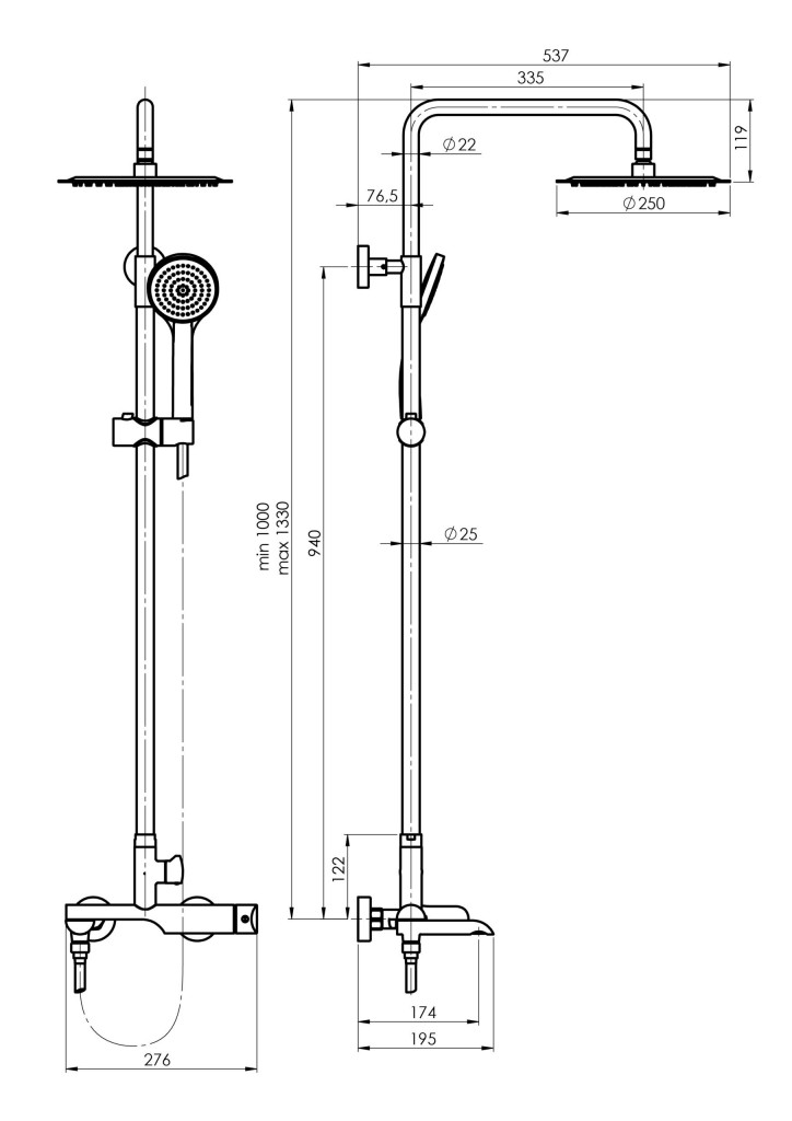 - Regulovateľná výška hlavovej sprchy 881 - 1211 mm