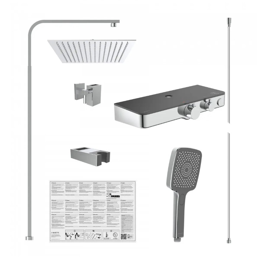 Elegantný sprchový set OCEAN v kombinácii chrómu a antracitu prináša do kúpeľne moderný štýl a vysoký užívateľský komfort. Súčasťou je termostatická batéria s vymeniteľným termostatickým prvkom a keramickou kartušou s ventilom ½" (Ø cca 1,9 cm) , ktorá zaisťuje presnú reguláciu teploty aj prietoku vody.