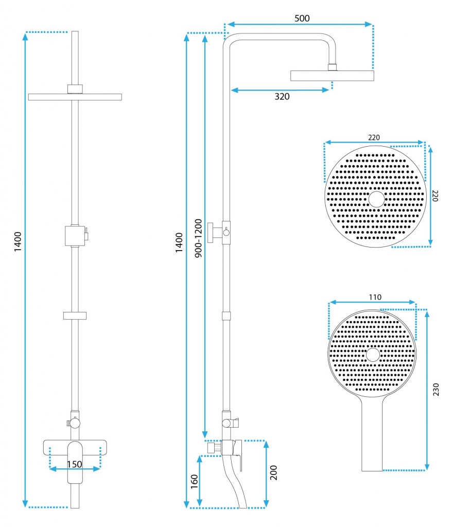 - ABS hlavové sprchy s priemerom 22 cm, guľový kĺb umožňujúci ľubovoľné polohovanie dažďovej sprchy