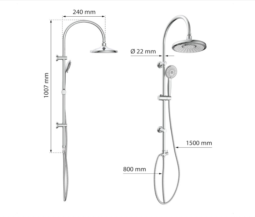 Výška setu je 102 cm, vzdialenosť výtoku horné sprchy od steny je 245 mm