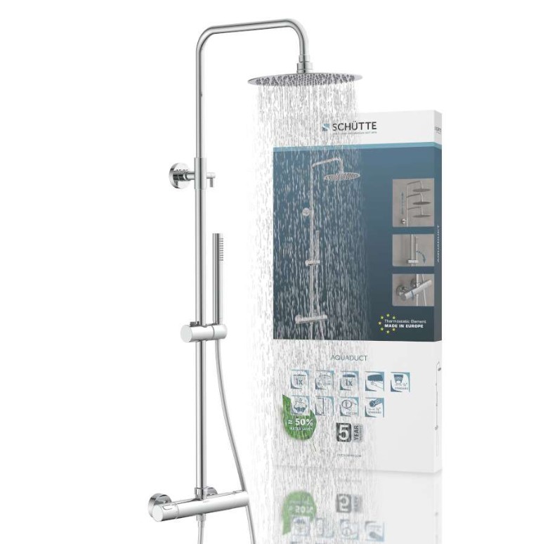 Elegantný sprchový set AQUADUCT v lesklom chrómovom prevedení spája nadčasový design s maximálnou funkčnosťou. Vďaka termostatickej batérii si môžete jednoducho nastaviť a udržať ideálnu teplotu vody pre pohodlné a bezpečné sprchovanie.