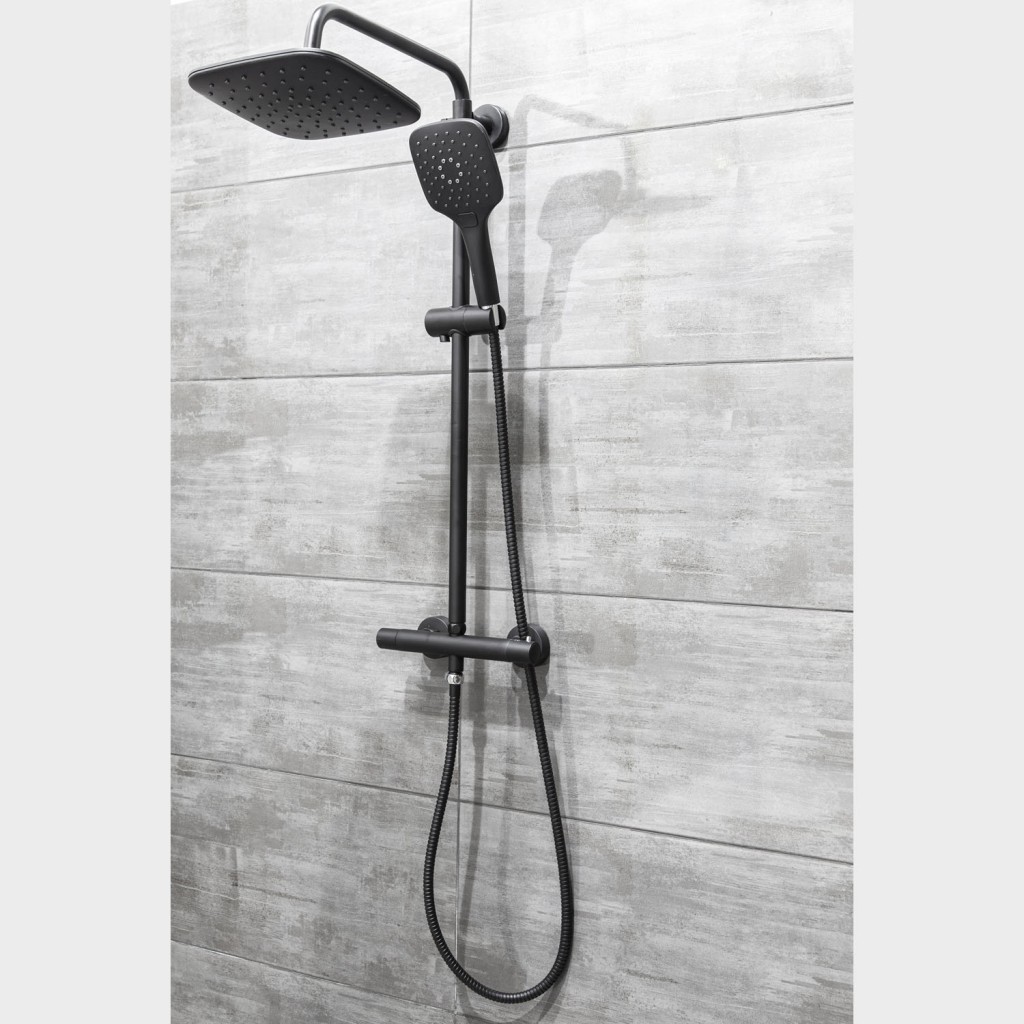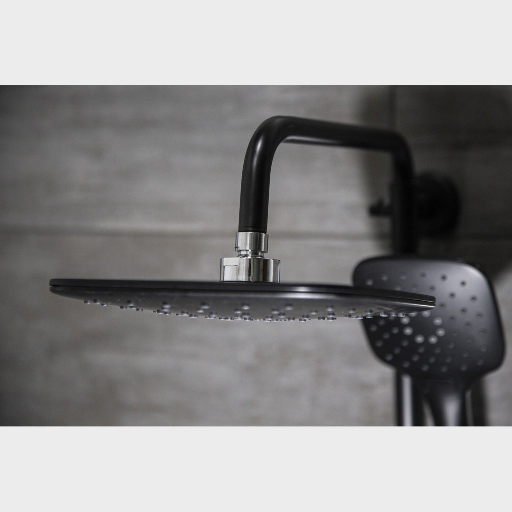 Sprchový set s termostatickou batériou a dažďovou sprchou v čiernom polomatnom prevedení , čo je stále obľúbenejšia farba pri zariaďovaní kúpeľní.