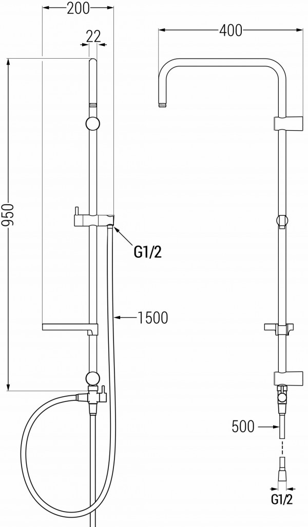 Rozmery držiaka sú: šírka lišty 22 mm, výška 950 mm a hĺbka od steny je 400 mm.