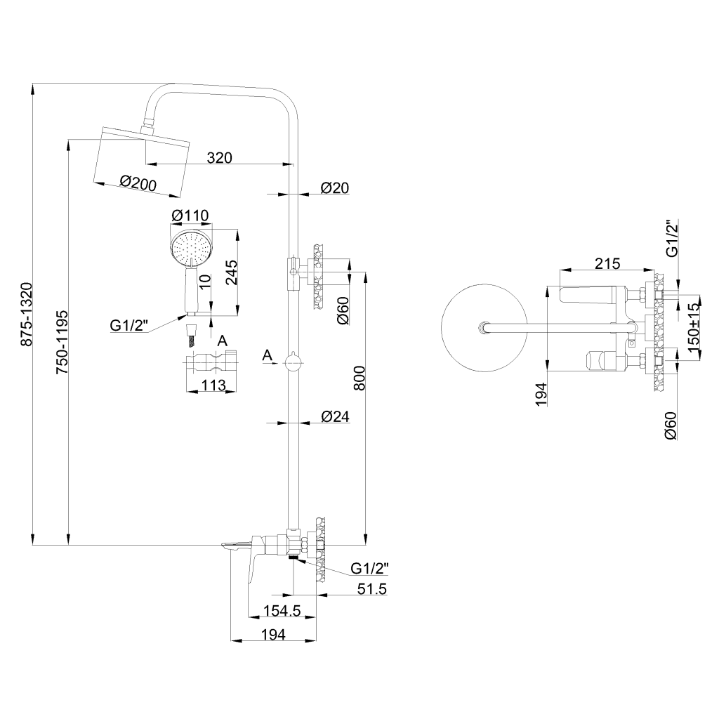 - výškovo nastaviteľný sprchový stĺp od 87,5 do 132 cm