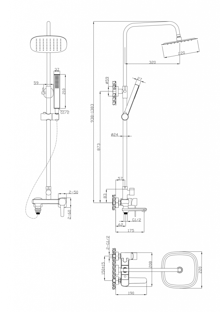 - v ýškovo nastaviteľný sprchový stĺp od 94 do 138 cm
