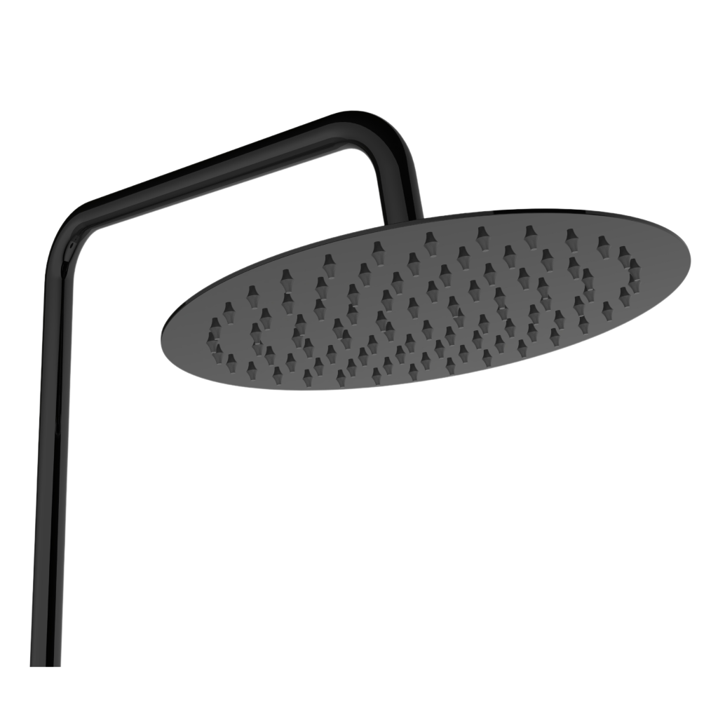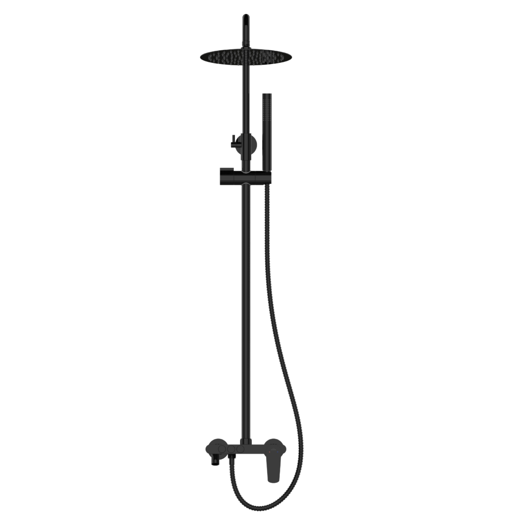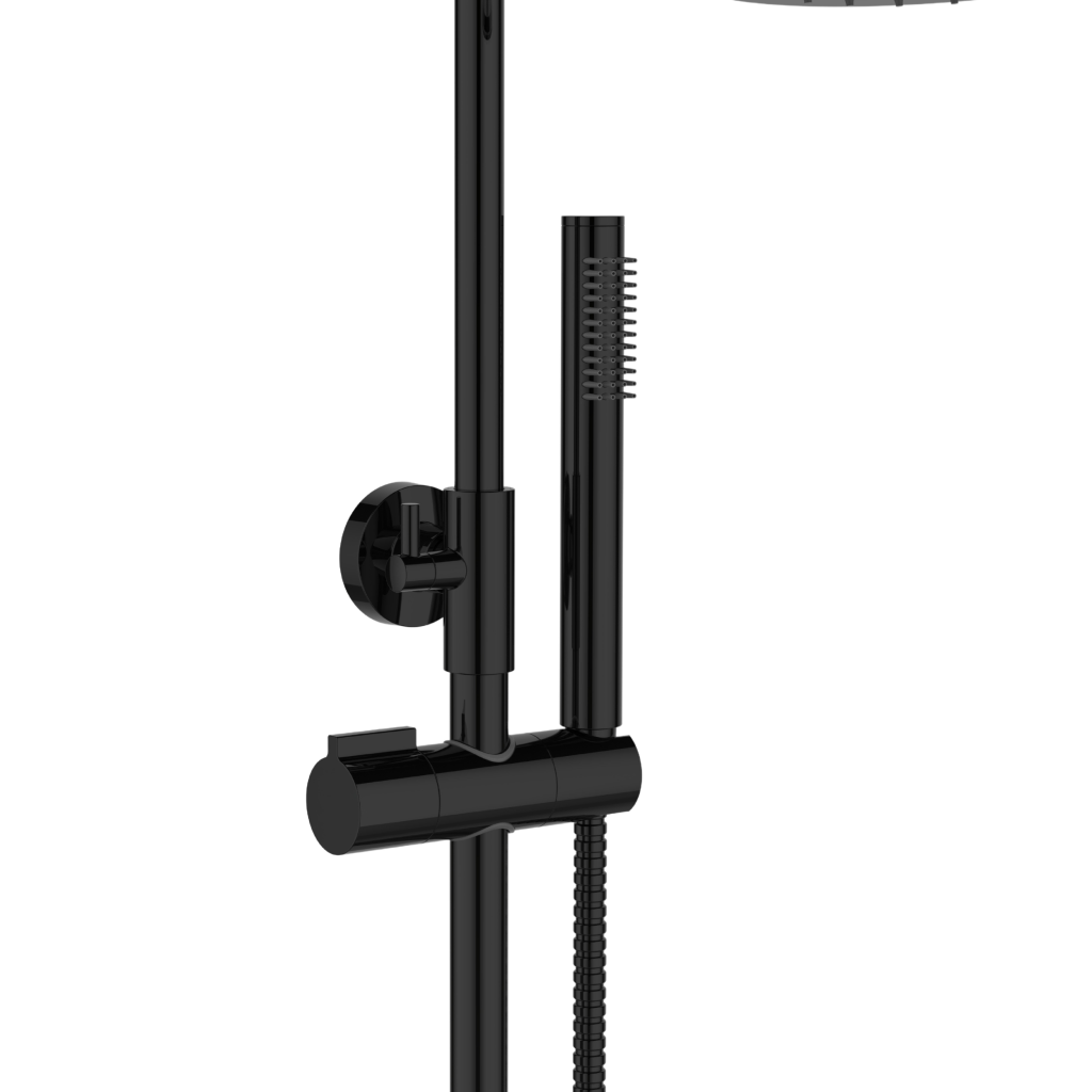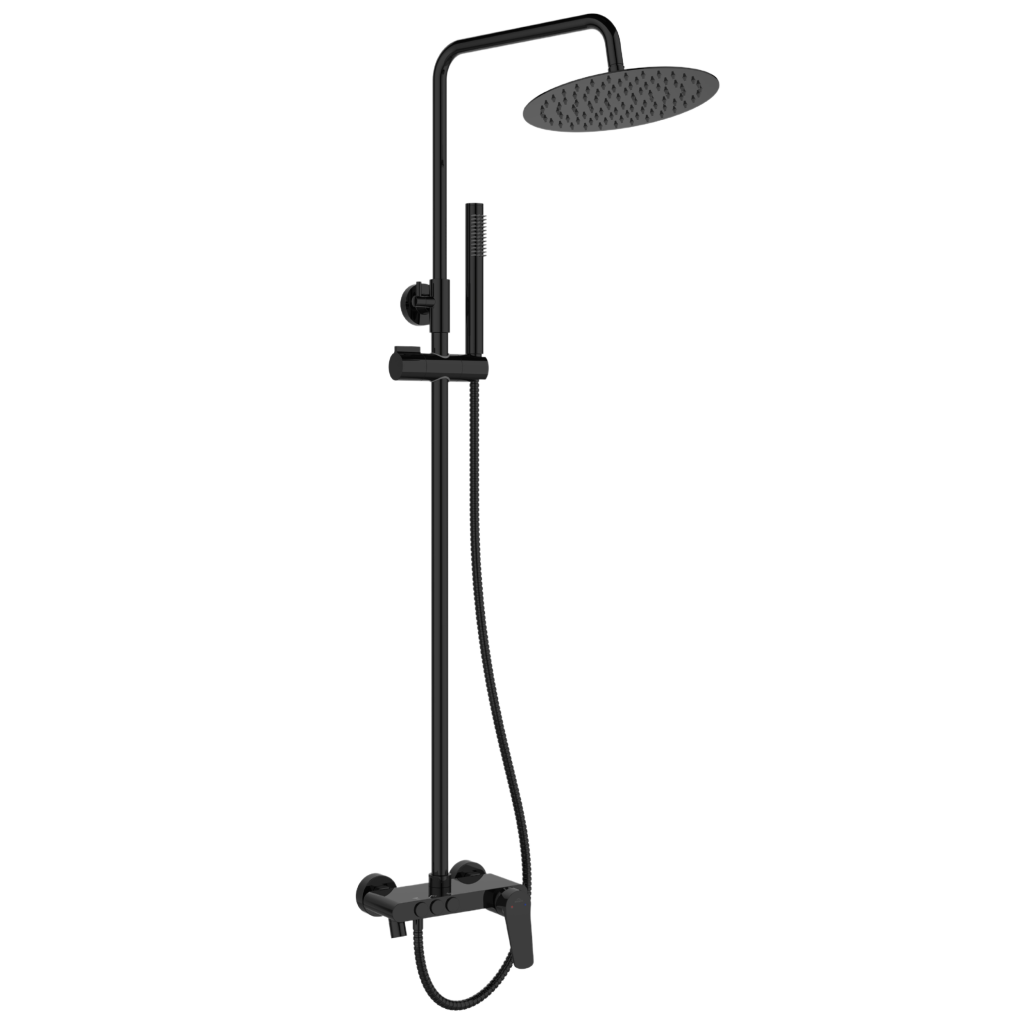 Sprchová batéria ALONIA Rain v lesklej čiernej farbe je elegantnou a funkčnou voľbou pre moderné kúpeľne. Výškovo nastaviteľný sprchový stĺp (87–135 cm) sa ľahko prispôsobí rôznym používateľom, zatiaľ čo veľká horná sprcha s priemerom 25 cm ponúka príjemný dažďový prúd pre maximálnu relaxáciu.