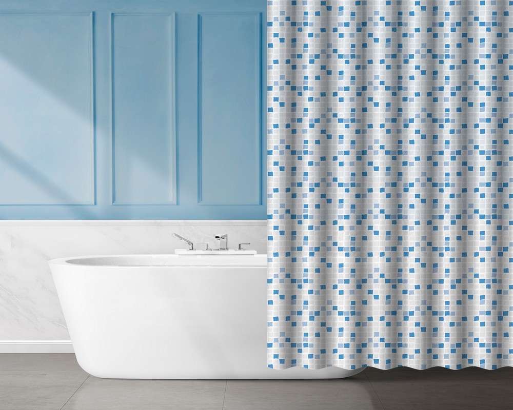 Vodeodolný, priesvitný sprchový záves s modrými štvorčekmi. Je vyrobená z materiálu EVA, teda kvalitnej fólie, ktorá sa vyznačuje vysokou kvalitou, nepremokavosťou, príjemným na dotyk a ľahko sa čistí. Súprava obsahuje 12 bielych závesných krúžkov. Fóliový sprchový záves je vhodný na jemné ručné čistenie pri 30 stupňoch.
