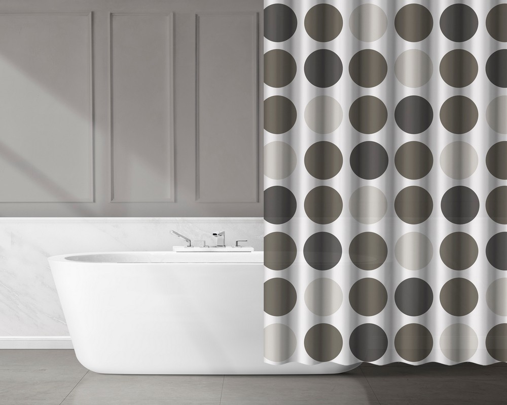 Vodeodolný, priesvitný sprchový záves s motívom veľkých, hnedých kruhov. Je vyrobená z materiálu EVA, teda kvalitnej fólie, ktorá sa vyznačuje vysokou kvalitou, nepremokavosťou, príjemným na dotyk a ľahko sa čistí. Súprava obsahuje 12 bielych závesných krúžkov. Fóliový sprchový záves je vhodný na jemné ručné čistenie pri 30 stupňoch. Nežehliť, nečistiť chemicky, nebieliť, nesušiť v sušičke.