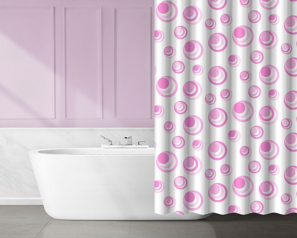 Vodeodolný sprchový záves v bielej farbe s motívom ružových kruhov v rôznych odtieňoch. Súprava obsahuje 12 bielych závesných krúžkov. Fóliový sprchový záves je vhodný na jemné ručné čistenie pri 30 stupňoch. Nežehliť, nečistiť chemicky, nebieliť, nesušiť v sušičke.