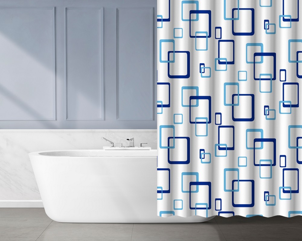 Vodeodolný sprchový záves v bielej farbe s geometrickým motívom modrých a tmavomodrých štvorcov. Súprava obsahuje 12 bielych závesných krúžkov. Fóliový sprchový záves je vhodný na jemné ručné čistenie pri 30 stupňoch. Nežehliť, nečistiť chemicky, nebieliť, nesušiť v sušičke.