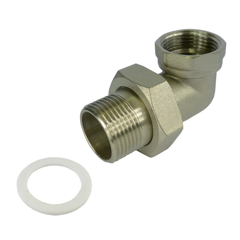 Radiátorové šróbenie rohové v prevedení poniklovaná mosadz, s prevlečnou maticou a plochým tesnením