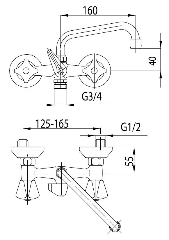 Nástenná umývadlová batéria STANDARD od výrobcu KFA ARMATUR A s rozstupom 150 mm. Výhodou je otočné ramienko s dĺžkou 160 mm a perlátorom. Prídavné pripojenie 3/4" (práčka/umývačka riadu)