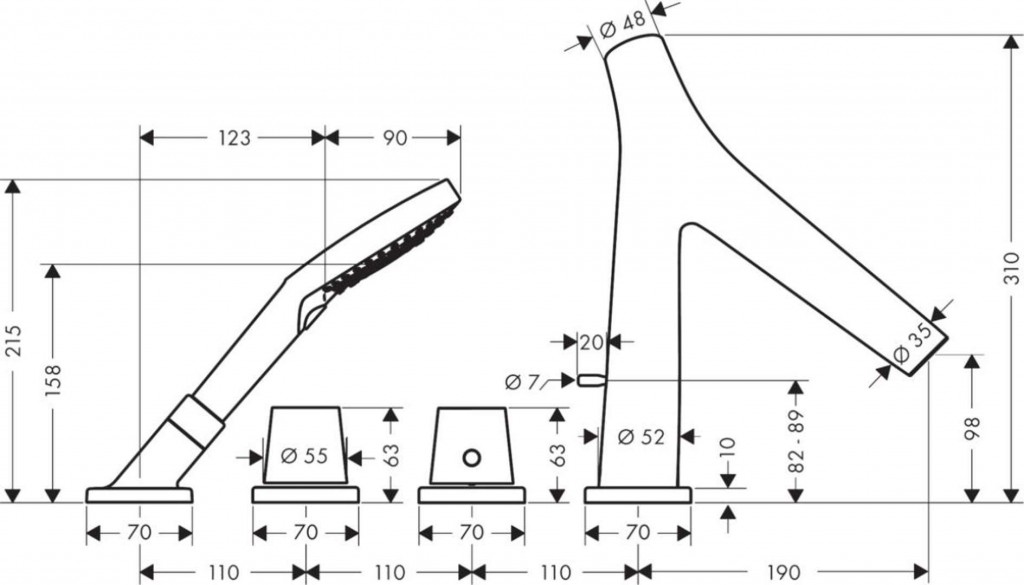- obsahuje rukoväte, termostatickú kartušu, uzatvárací ventil, vaňový výtok s prepínačom a ručnú sprchu Axor sa 3 prúdy # 26050xxx