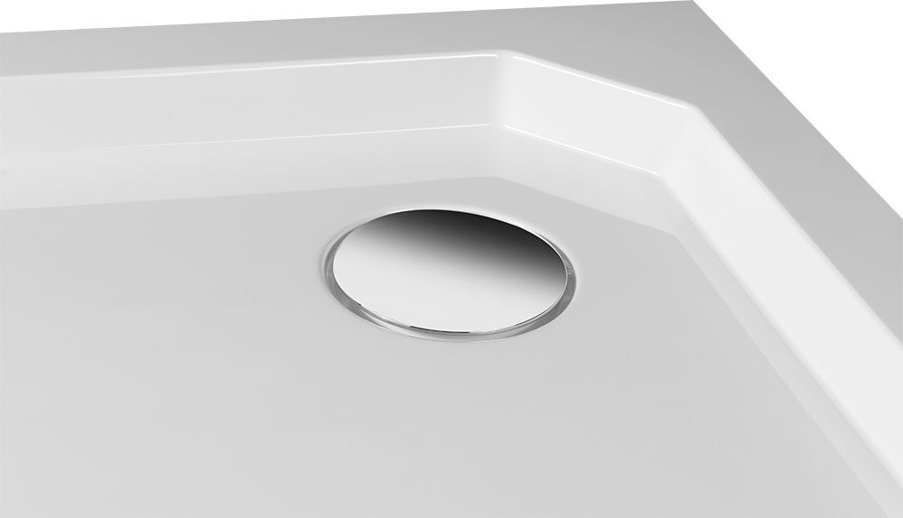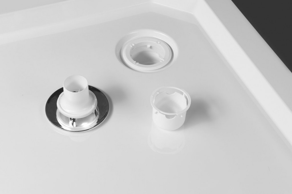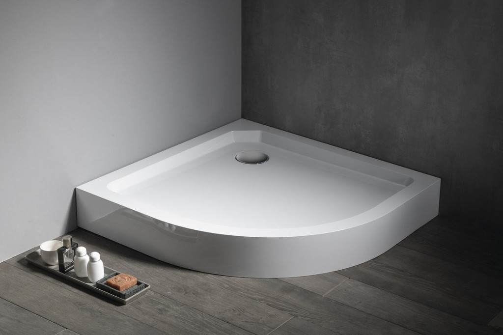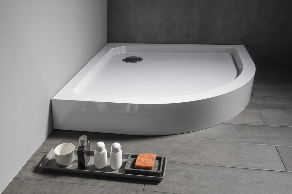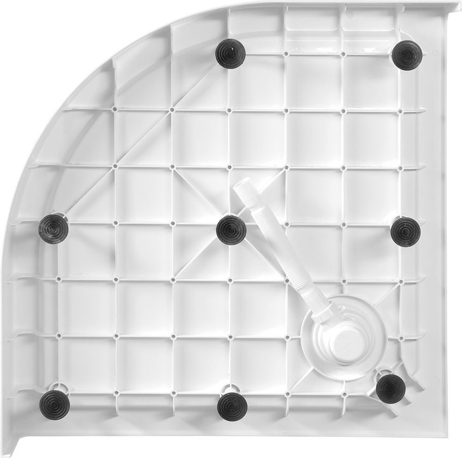 Štvrťkruhová samonosná vanička so sifónom s priemerom 90 mm, nožičky pre lepšiu stabilitu.