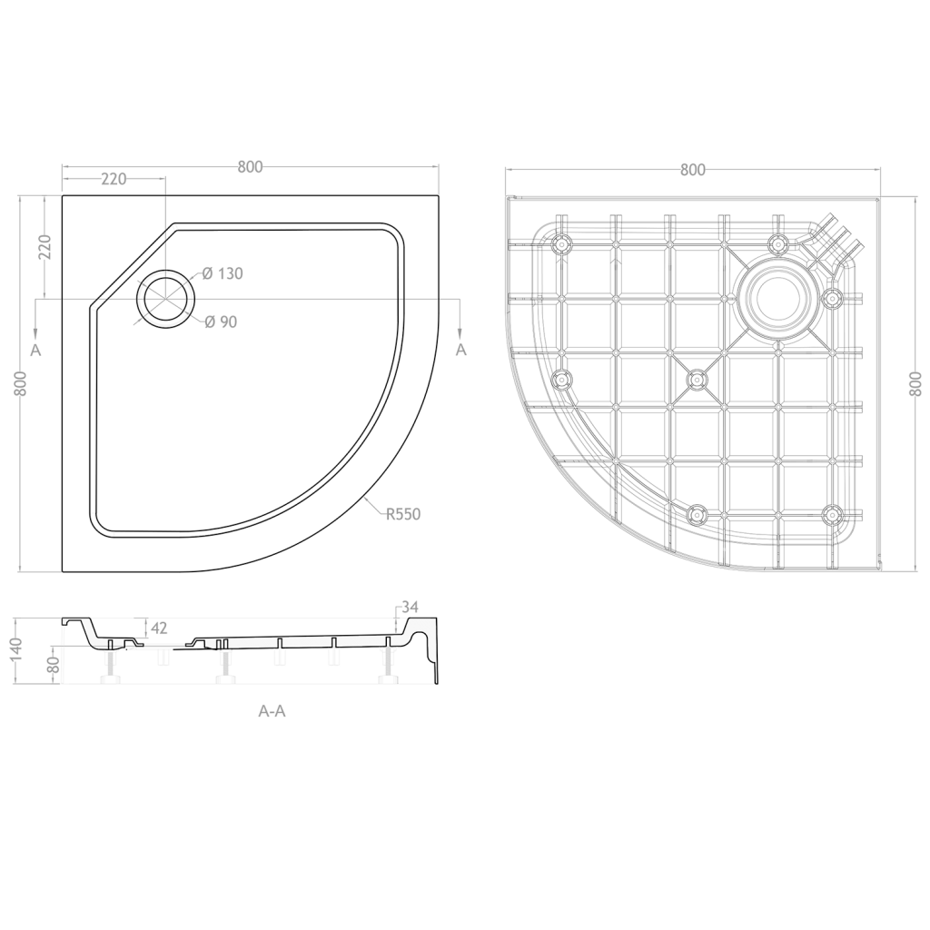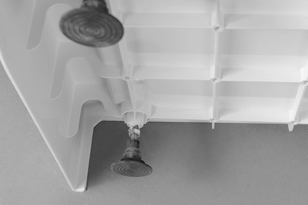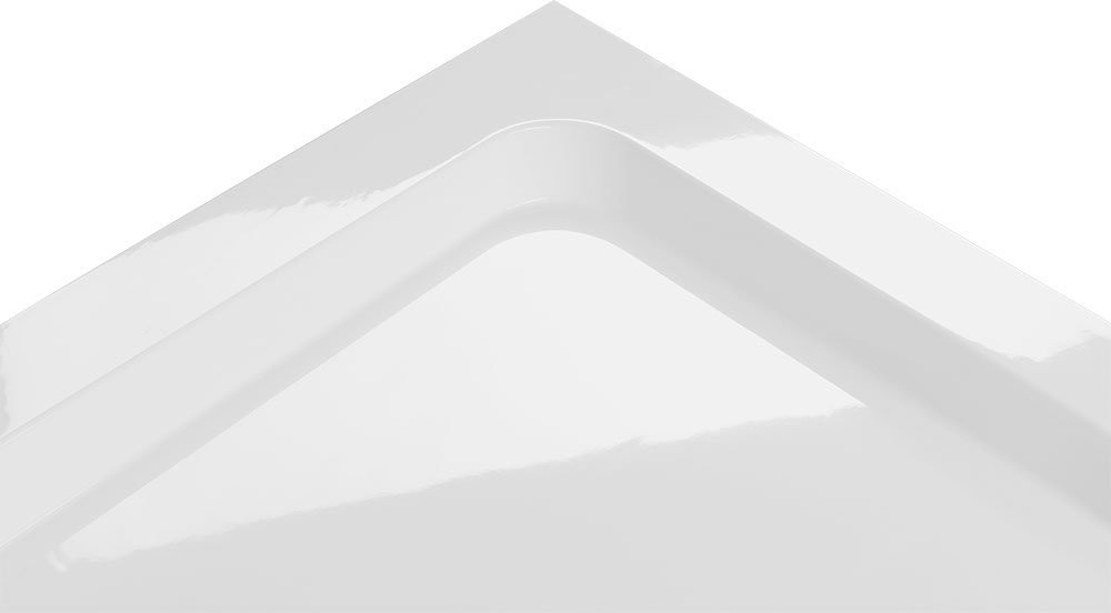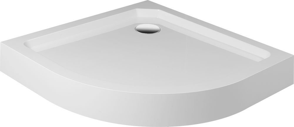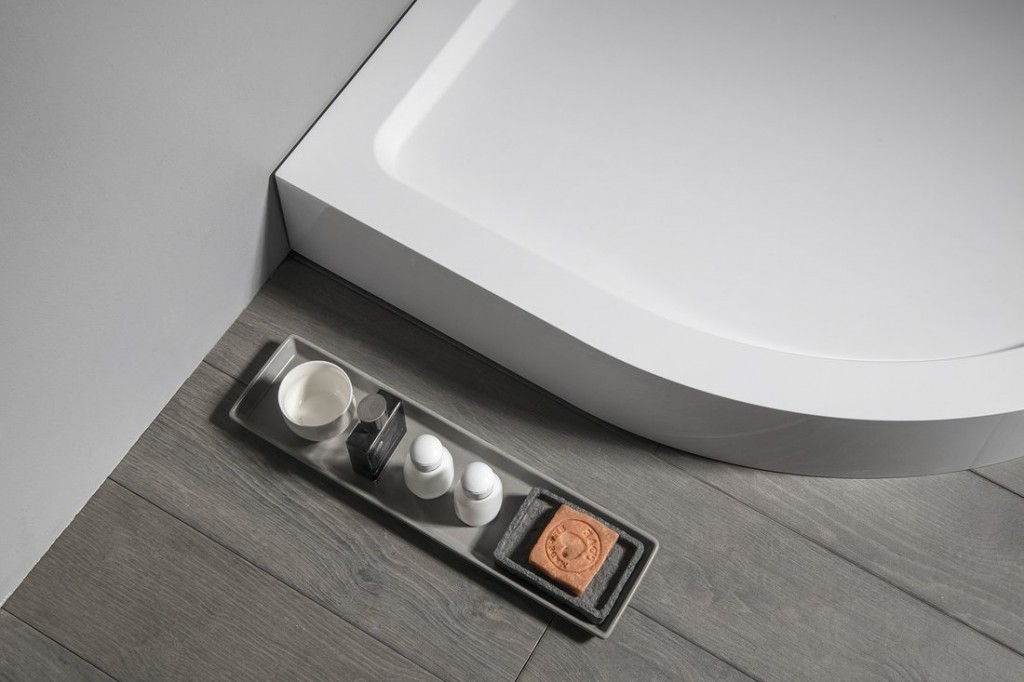 Štvrťkruhová samonosná vanička so sifónom s priemerom 90 mm, nožičky pre lepšiu stabilitu.