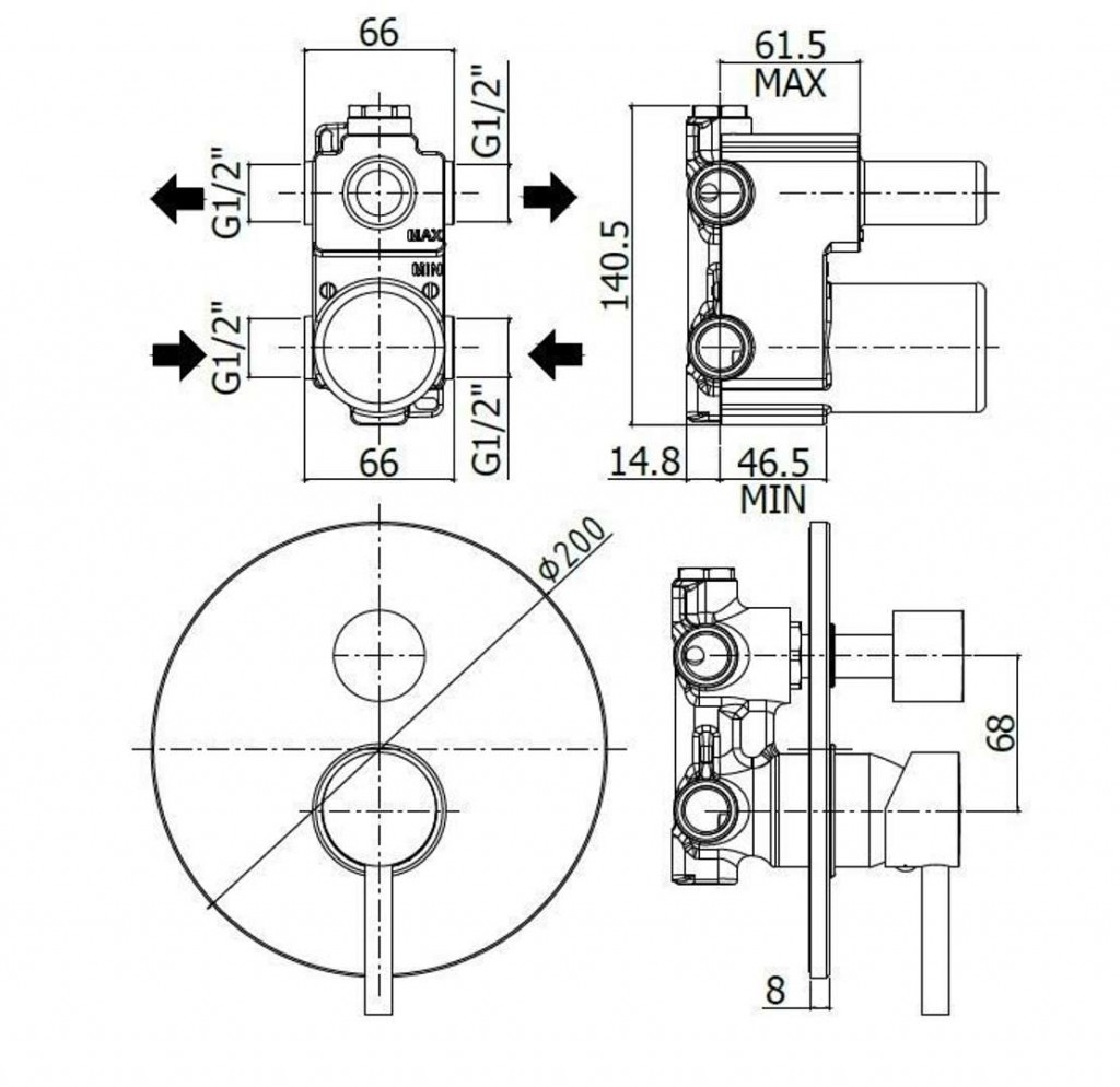 Sprchová páková batéria s otočným prepínačom vrátane podomietkového telesa pre 2 vývody