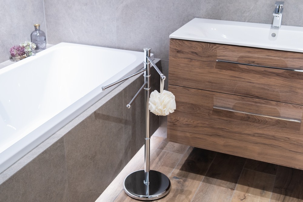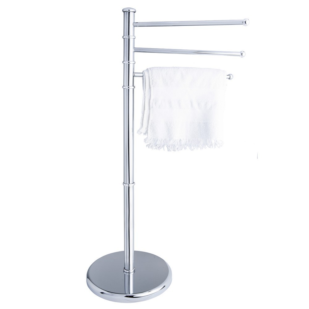 Trojramenný samostatne stojaci kúpeľňový vešiak z vysoko lesklej chrómovanej ocele. Výrobok vyžaduje vlastnú montáž.