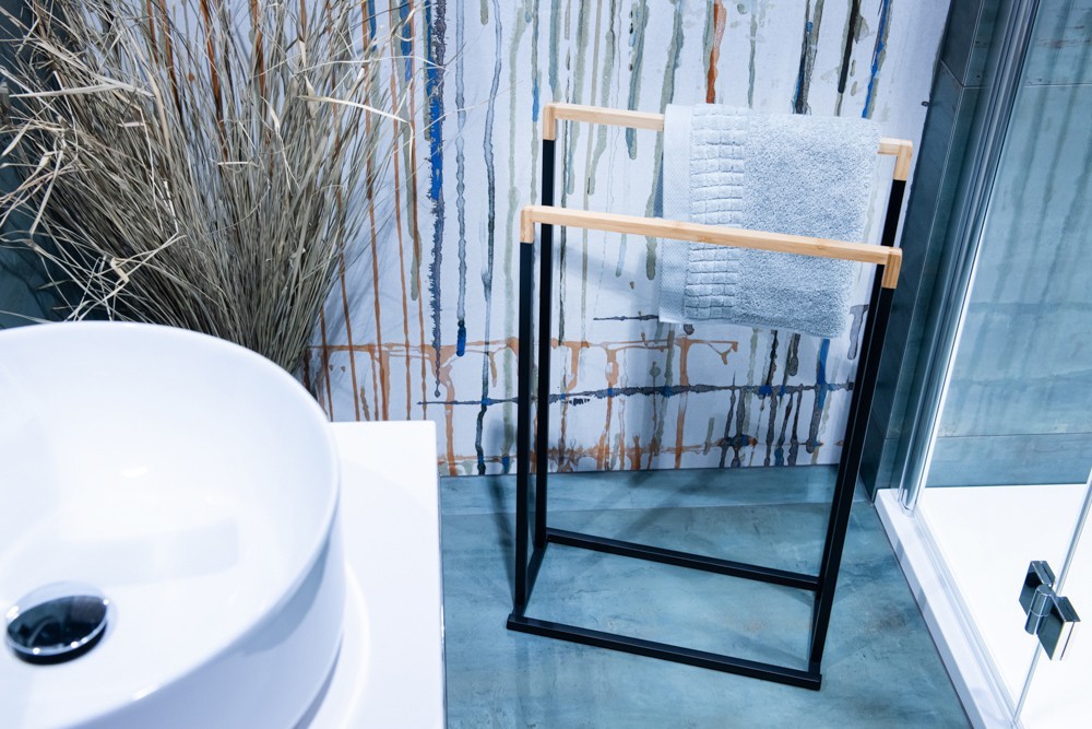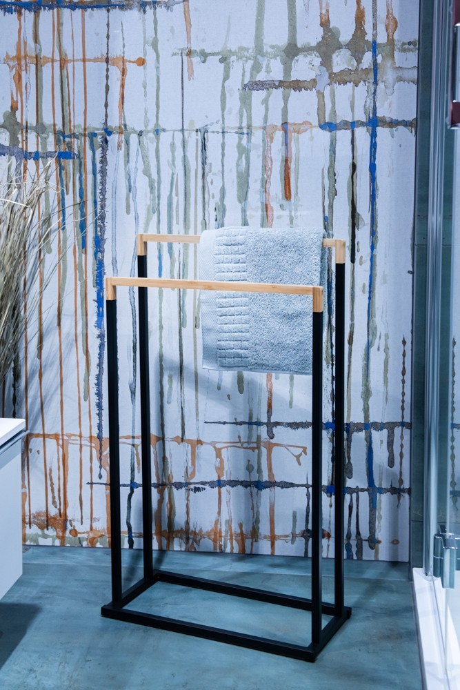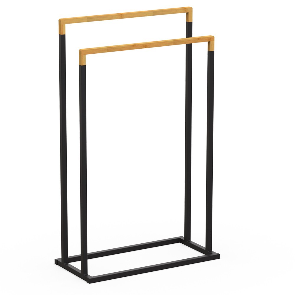 Moderný stojaci vešiak na uteráky s dvoma ramenami, navrhnutý v jednoduchej geometrickej forme. Je vyrobená z čierno lakovanej ocele s matným povrchom a na výrobu paží bolo použité prírodné bambusové drevo. Stojan na uteráky má stabilnú základňu zaistenú plastovými nožičkami. Výrobok vyžaduje vlastnú montáž.