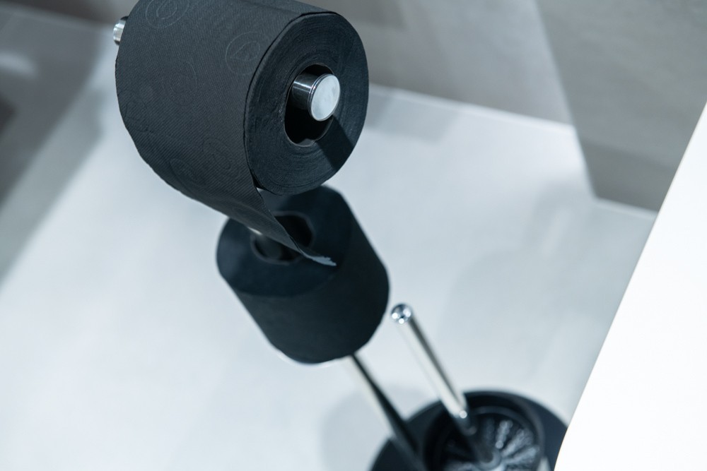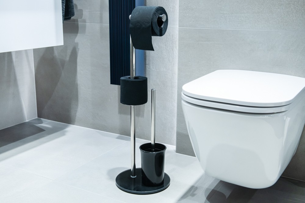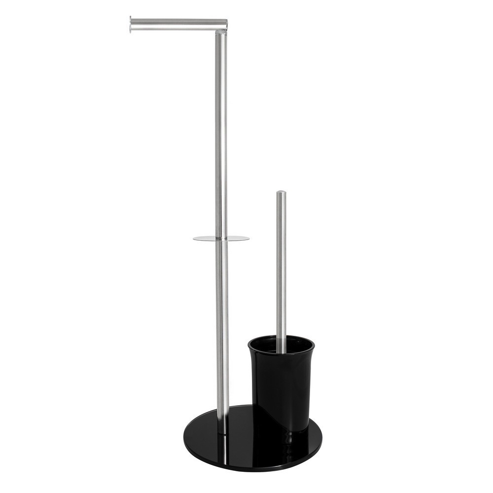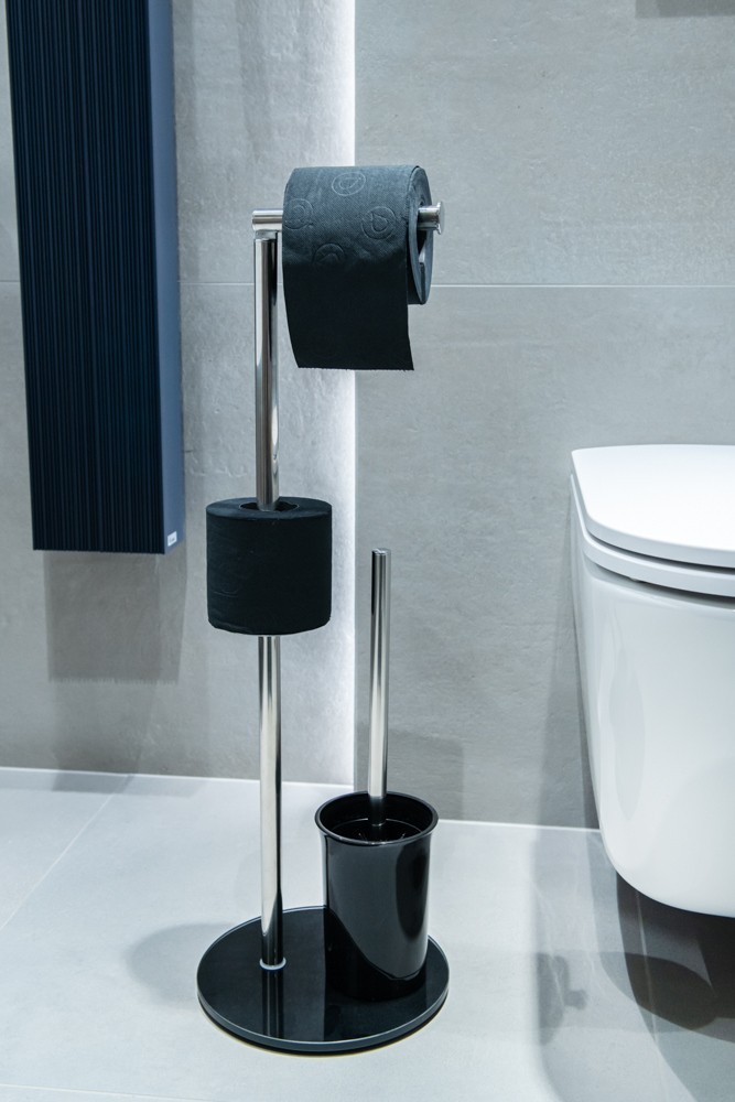 Stojan na toaletný papier so štetkou a priestorom pre náhradnú rolu papiera. Má čiernu základňu a čierny zásobník na štetku, čo mu dodáva moderný vzhľad.