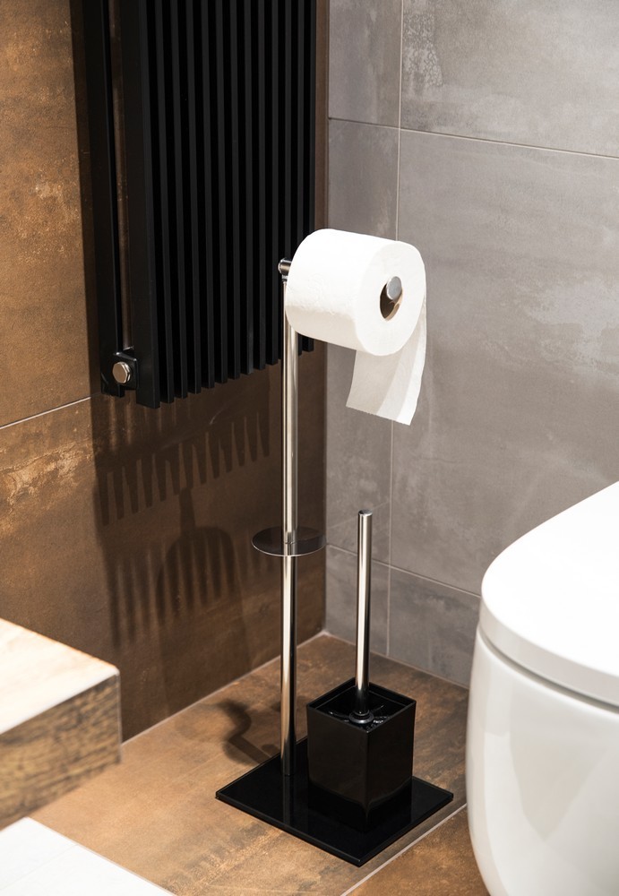 Stojan na toaletný papier so štetkou a priestorom pre náhradnú rolu papiera. Má čiernu základňu a čierny zásobník na štetku, čo mu dodáva moderný vzhľad.