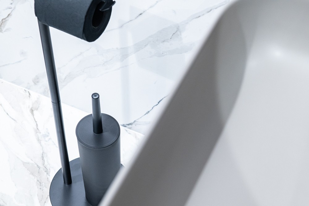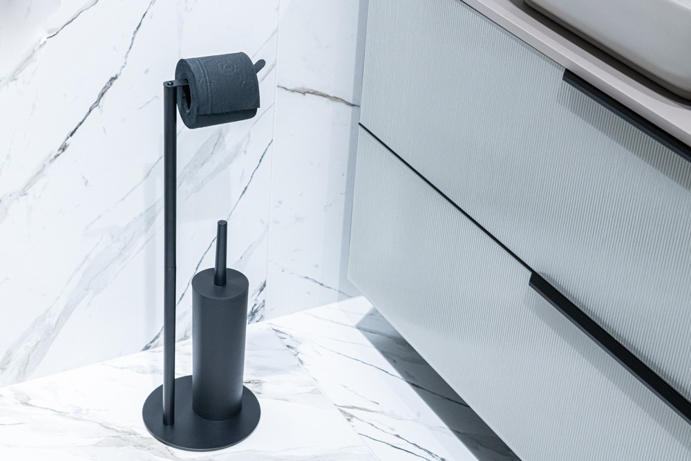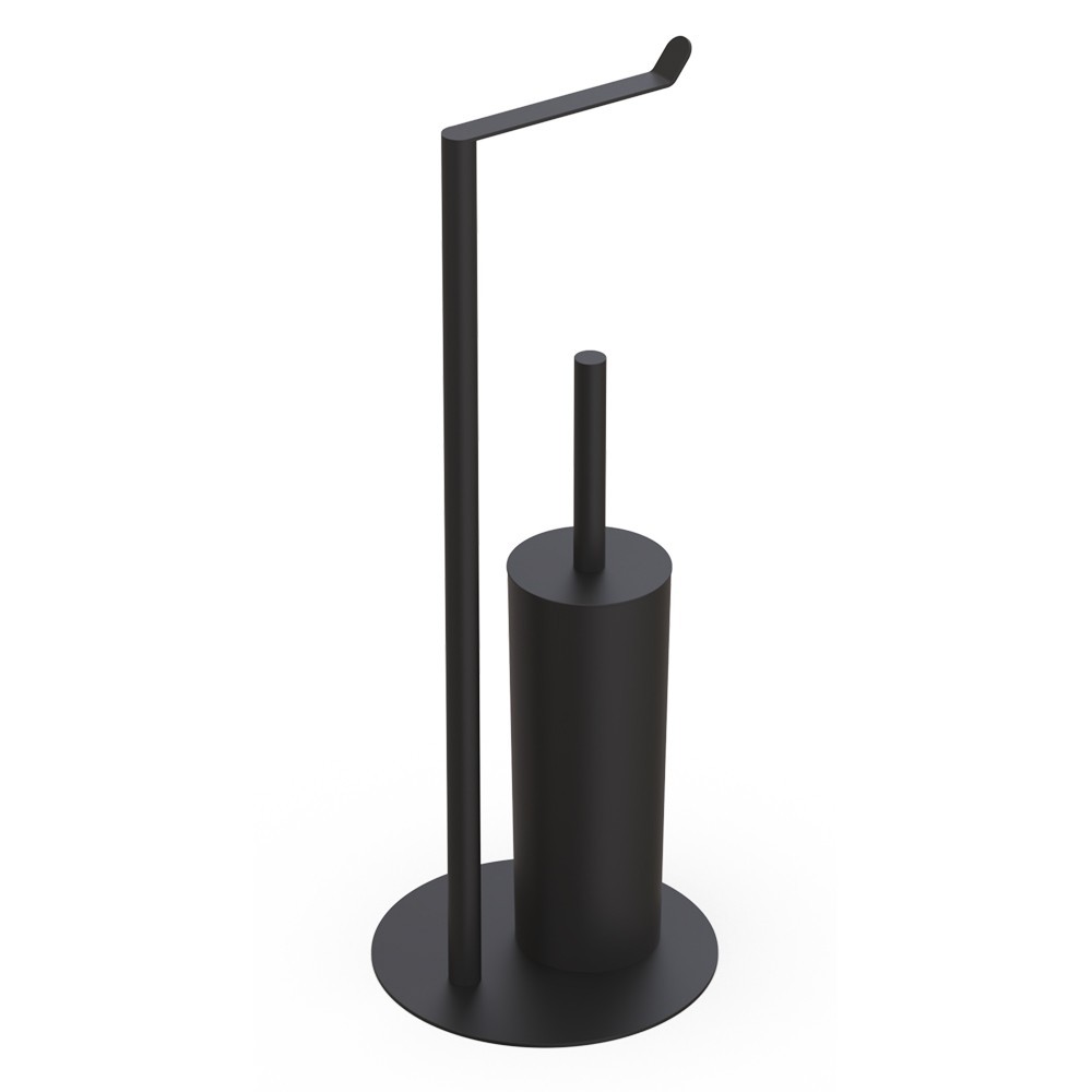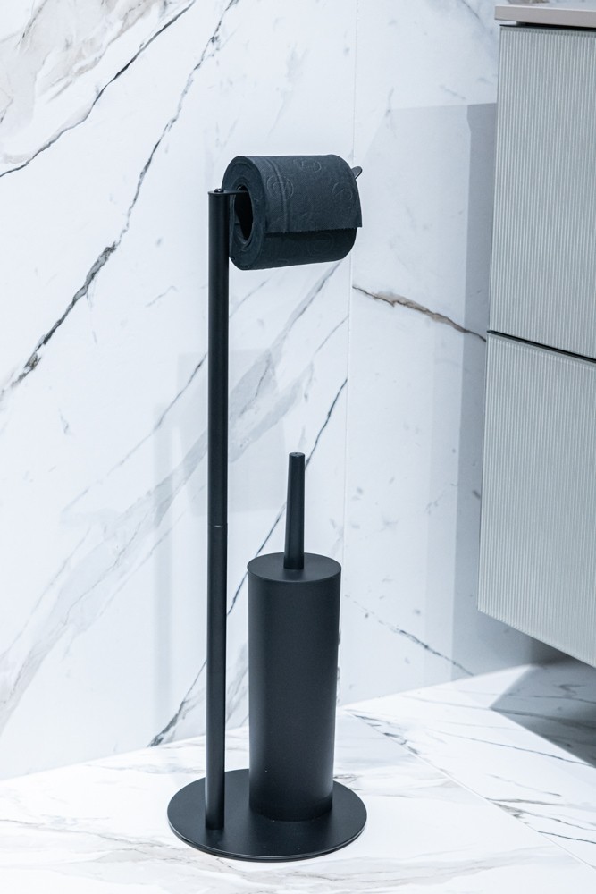 Moderný a minimalistický stojan na toaletný papier s toaletnou štetkou. Je vyrobený z ocele lakovanej matnou čiernou farbou. Má stabilnú guľatú základňu. Vnútri nádoby na WC kefu je vyberateľná plastová vložka, ktorá uľahčuje hygienu. Výrobok vyžaduje vlastnú montáž.