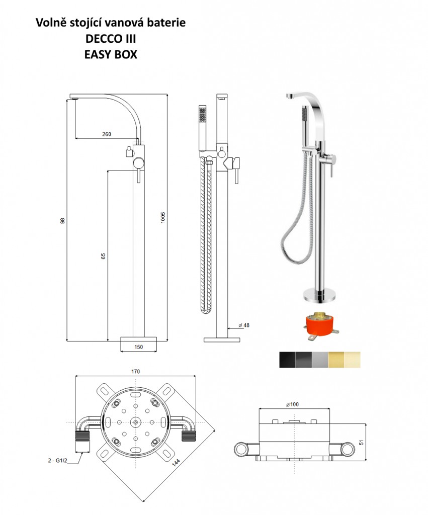 Vysoká vaňová batéria DECCO III s výškou 1005 mm od európskeho dodávateľa vodovodných batérií BESCO . Batéria je určená na inštaláciu do podlahy (vrátane inštalačného boxu pre jednoduchšiu inštaláciu) a oceníte ju najmä ak máte voľne stojacu vaňu. Dodávané vrátane príslušenstva - sprchová hlavica s hadicou. Stojanková vaňová batéria pre moderné kúpeľne. Dodávame v troch farbách a to lesklý chróm , čierna matná alebo grafitová .
