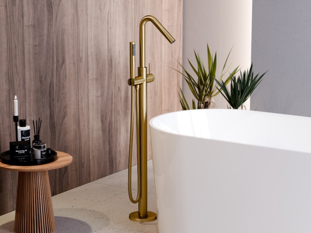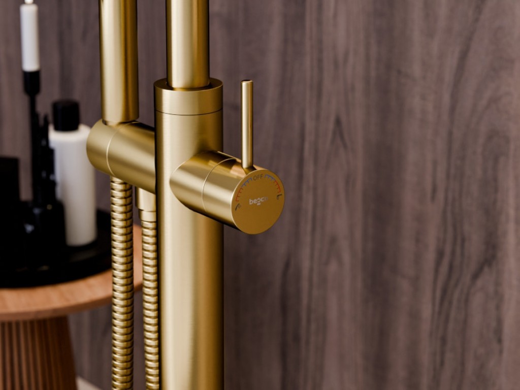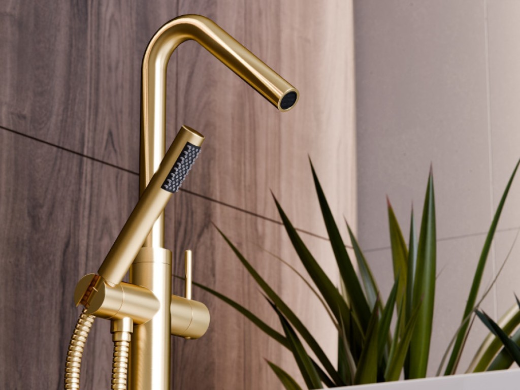 Vysoká vaňová batéria VEO III v zlatej brúsenej farbe s výškou 1102 mm od európskeho dodávateľa vodovodných batérií BESCO . Batéria je určená na inštaláciu do podlahy (vrátane inštalačného boxu pre jednoduchšiu inštaláciu) a oceníte ju najmä ak máte voľne stojacu vaňu. Dodávané vrátane príslušenstva - sprchová hlavica s hadicou. Stojanková vaňová batéria pre moderné kúpeľne. Dodávame v piatich farbách a to chróm, čierna , grafitová, zlatá lesklá alebo zlatá brúsená.