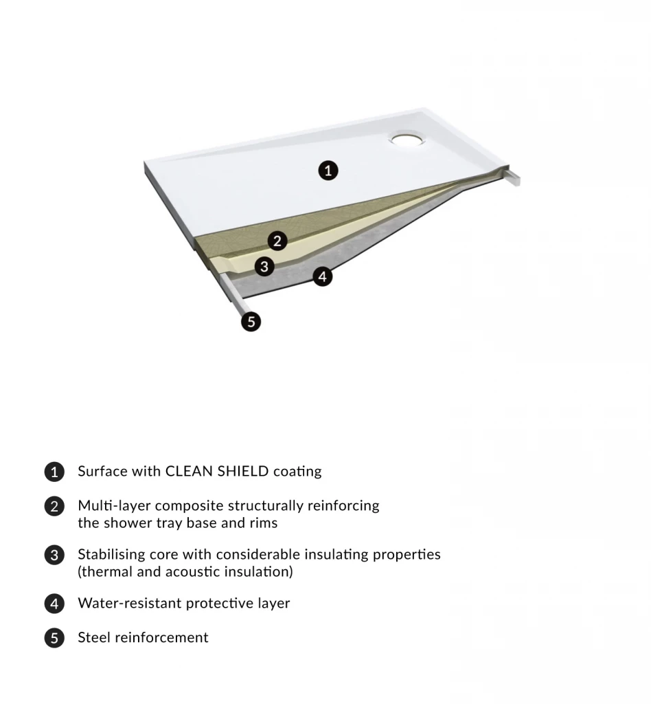 Sprchové vaničky STONE sú vyrobené z viacvrstvového kompozitného materiálu, ktorý zaisťuje vysokú odolnosť, pevnosť a dlhú životnosť. Matný povrch s prirodzenou kamennou štruktúrou je opatrený antibakteriálnou vrstvou CleanShield , ktorá uľahčuje údržbu a zlepšuje hygienu. Stabilizačná základňa poskytuje účinnú tepelnú i zvukovú izoláciu, zatiaľ čo tesniaca vrstva chráni pred vlhkosťou a tvorbou plesní.