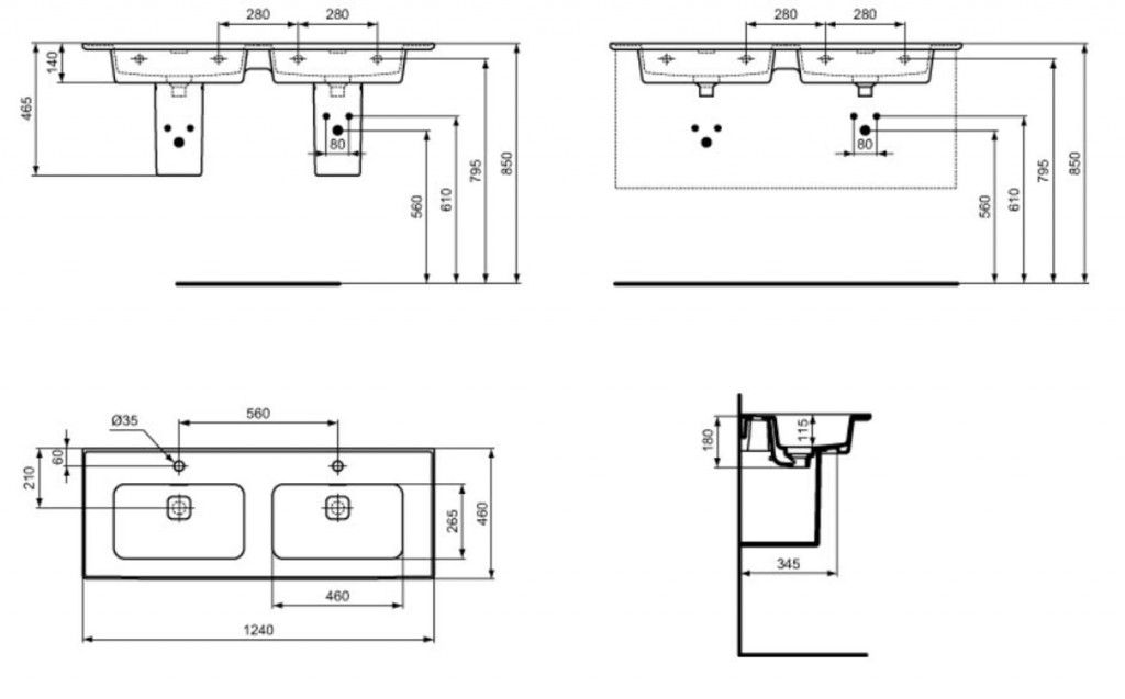 Nábytkové dvojumývadlo s 2 otvormi pre batériu