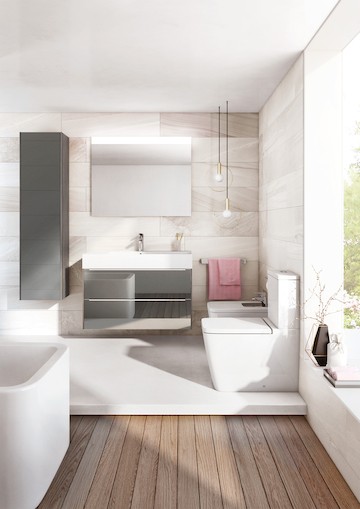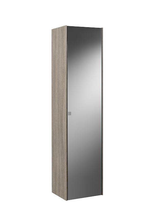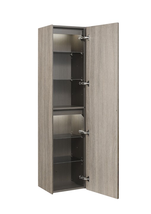 Závesný vysoký stĺpik v prevedení dub / čierne sklo s dvierkami otváranými vpravo / stlačením sa otvorí /. Súčasťou skrinky je vnútorné LED osvetlenie a 5 sklenených výškovo nastaviteľných políc.