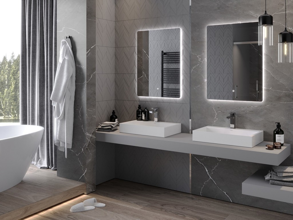 Moderné a jednoduché obdĺžnikové zrkadlo kolekcie SUN je vybavené LED podsvietením, ktoré sa ľahko ovláda pomocou dotykového tlačidla priamo na ploche zrkadla . Zrkadlo je vybavené vyhrievacou podložkou ANTI-CAR , ktorá eliminuje zahmlenie skla.
