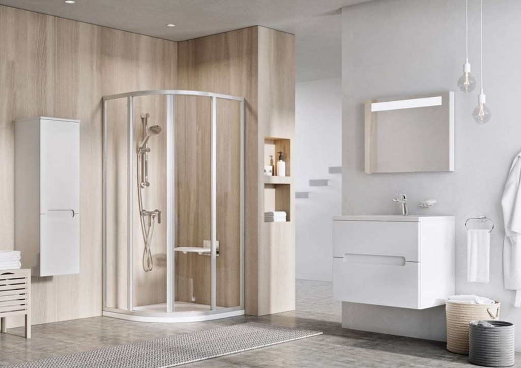 - inštalácia do obloženého rohu kúpeľne na sprchovú vaničku alebo priamo na podlahu so zabudovaným sprchovým žľabom či podlahovou vpustí