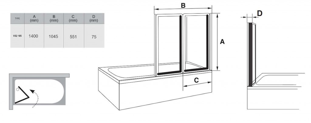 Zástena sa skladá z dvoch pohyblivých dielov, ktoré možno úplne zložiť do vnútorného priestoru nad vaňu. Vaňovú zástenu možno inštalovať na obdĺžnikové vane RAVAK s rovným horným lemom (Classic, Sonata, Vanda a Lilia) alebo na akékoľvek klasické obdĺžnikové vane s rovným horným lemom. Štandardná výška zásteny je 1400 mm. Vaňová zástena VS2 má v zloženom stave šírku 545 mm. Otočením vaňové zásteny VS2 o 180 ° získame variantu vstupu sprava či zľava.
