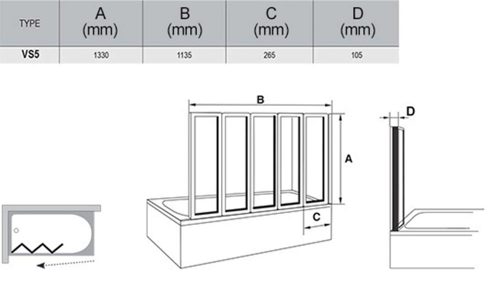 - inštalácie: zástena sa skladá z 5 pohyblivých dielov, ktoré možno úplne zložiť do vnútorného priestoru nad vaňu