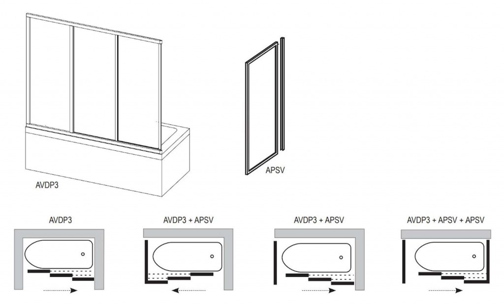 - možno inštalovať samostatne, alebo v kombinácii s pevnou vaňovou stenou APSV (rohový spojovací profil je súčasťou balenia pevné steny)