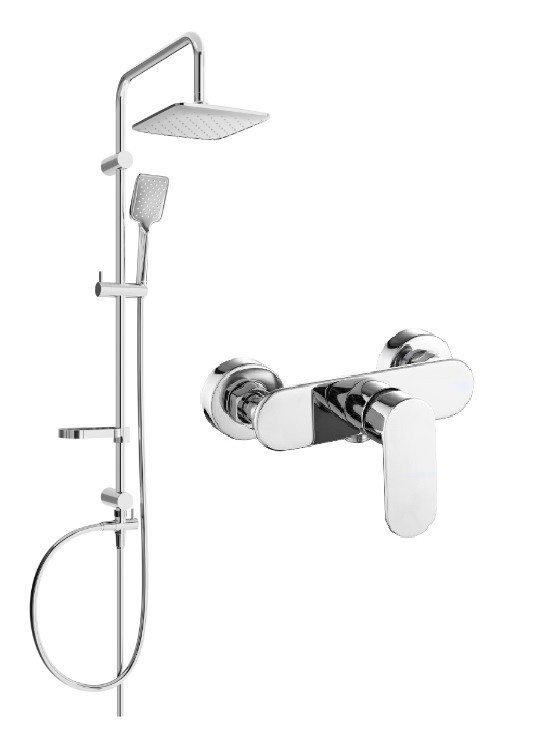 Sprchový stĺp je vyrobený z nerezovej ocele a ABS . Stĺp je uchytený k stene pomocou dvoch nastaviteľných, stenových držiakov , kedy je možné upraviť v prípade, že už máte pred vyvŕtané otvory. Hlavová sprcha je z plastu štvorcového tvaru , rozmeru 20x20 cm a je umiestnená pomocou guľového kĺbu na hornom ramene. Kĺb umožňuje nastavenie smeru prúdenia vody podľa vašich potrieb. Na tyči je umiestnená plastová mydlenka a posuvný držiak s plastovou 1 funkčnou ručnou sprchou , ktorá je prepojená pomocou hadice dlhej 150 cm k prepínaču medzi sprchami. Sprchový stĺp je navrhnutý na prepojenie batérie pomocou hadice dlhej 50 cm.