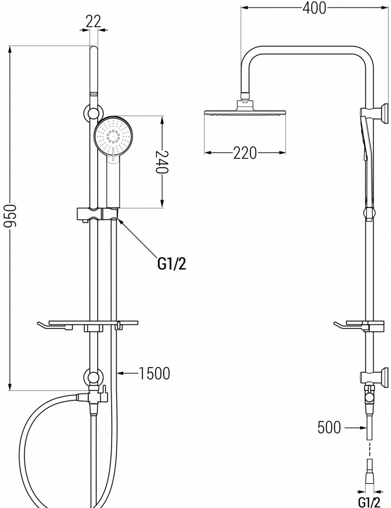 Sprchový stĺp je vyrobený z nerezovej ocele a ABS . Stĺp je uchytený k stene pomocou dvoch nastaviteľných, stenových držiakov , kedy je možné upraviť v prípade, že už máte predvŕtané otvory. Hlavová sprcha je z plastu okrúhleho tvaru , priemere 22 cm a je umiestnená pomocou guľového kĺbu na hornom ramene. Kĺb umožňuje nastavenie smeru prúdenia vody podľa vašich potrieb. Na tyči je umiestnená mydlenka a posuvný držiak s plastovou 3 funkčnou ručnou sprchou , ktorá je prepojená pomocou hadice dlhej 150 cm k prepínaču medzi sprchami. Sprchový stĺp je navrhnutý na prepojenie batérie pomocou hadice dlhej 50 cm.