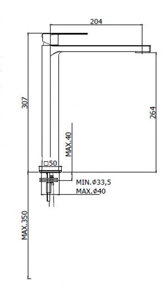 - dĺžka výtoku 204 mm, komfortná zóna 264 mm