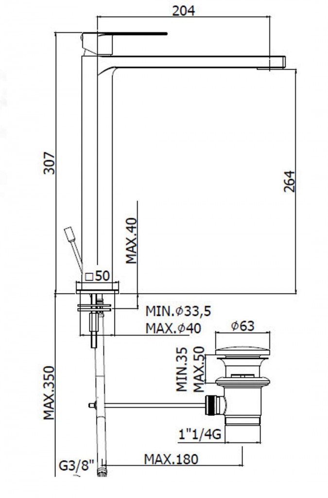 - dĺžka výtoku 204 mm, komfortná zóna 261 mm