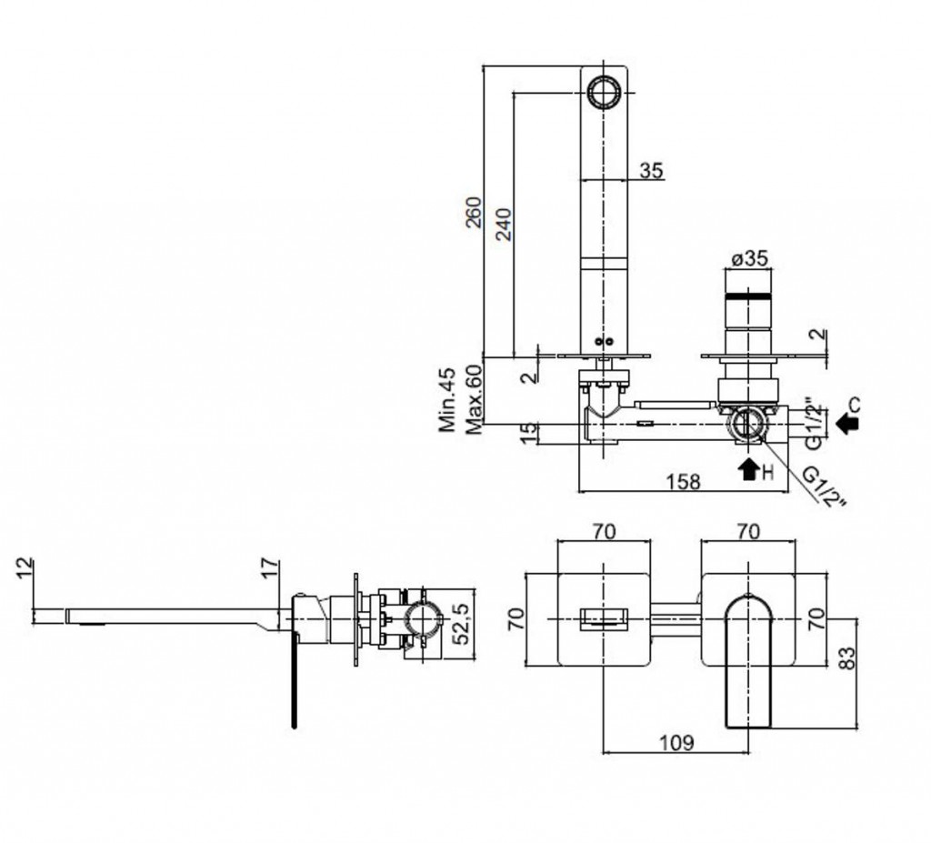 Umývadlová 2 prvková nástenná páková batéria pod omietku s telesom