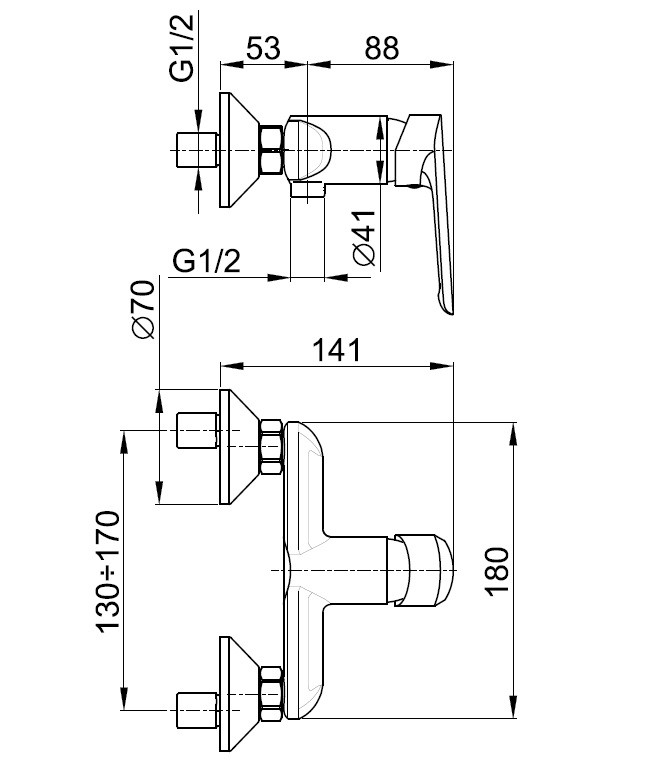 Nástenná sprchová batéria TANZANIT od výrobcu KFA ARMATUR A s rozstupom 150 mm bez príslušenstva.