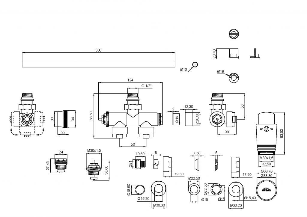 - jednootvorový termostatický ventil ½” s rozstupom 50 mm
